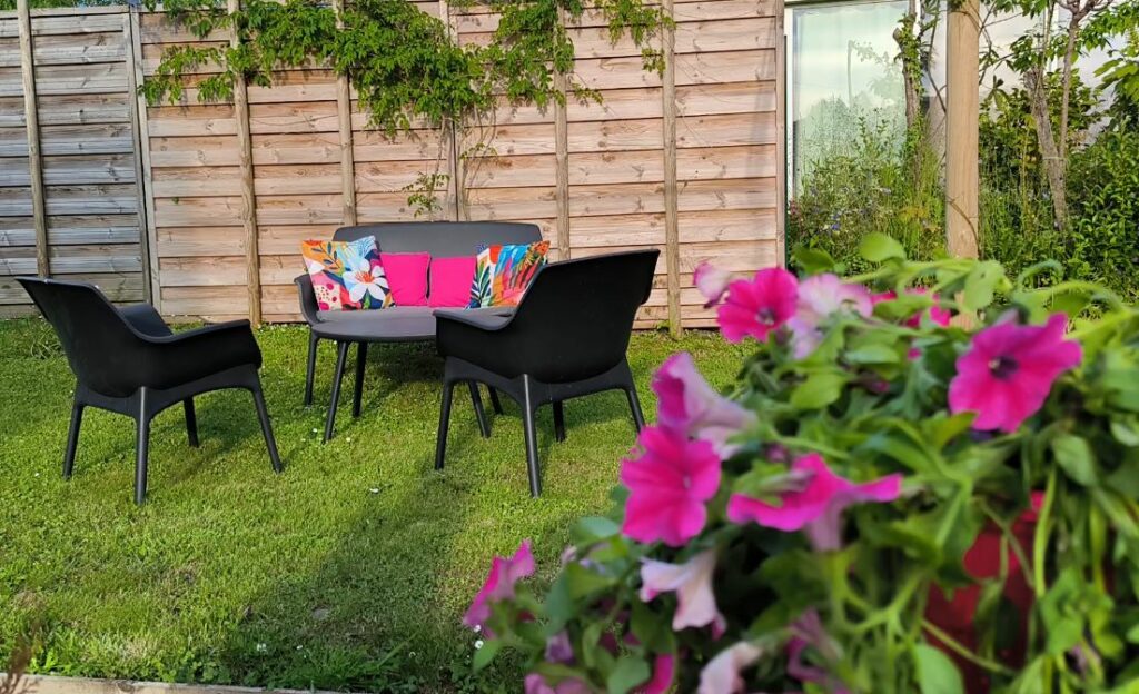 Vous disposez d’un salon de jardin cosy où vous pourrez profiter du soleil jusqu’au soir.