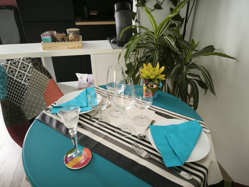 Se restaurer en toute simplicité ou se préparer une jolie table romantique. De la vaisselle et un micro-onde sont à votre disposition ainsi qu’une cafetière et une bouilloire.